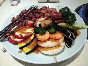 で、キムチがなくなった頃、お待ちかねの「野菜&カルビのセット」が登場・・・もちろん、ガンガン焼いて食べる・・・うわさ通り実に美味い。続いてタン塩が登場・・・いかにものバラの花風レイアウトだが、あっと言う間に散ってしまったのは言うまでもない。ただし、おやじ的にはタレを焼いた網でのタン塩はちょっと残念・・・。