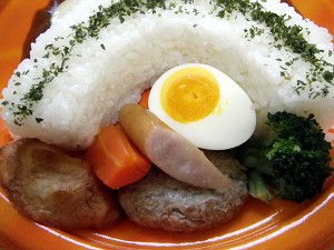 「黒部ダムカレー」なので提体は当然アーチ式、ダム湖にはクリームが流され、下流側には岩石として?じゃがいも、にんじん、ブロッコリー、ゆで卵、ウィンナー、ハンバーグが置かれている。セーブオンの「ダムカレー」に比べてかなり派手だが、向こうは大盛りで398円だから、当たり前かも。