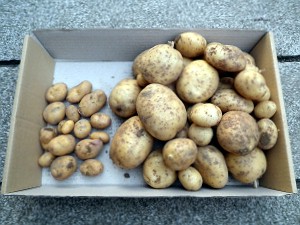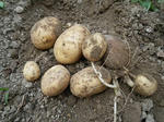 で、その「インカのめざめ」から掘ってみると・・・案の定、直径2~3cmくらいの超小玉がわずかに出てきたのみ・・・3株とも親芋の方が大きくダメダメだった (´・ω・`)