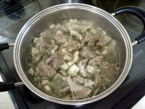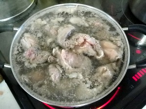 アクやアブラを取りながらゆでる。「沸騰させた湯からゆでる」のは「牛すじ肉のうまみを逃がさず、全体の筋を縮ませる」からだそうだ。それにしても、アブラの臭いがすごい・・・換気扇を回していてもキッチンにあっという間に充満してしまう。いくら肉好きなおやじでもさすがにこれは堪らない・・・。