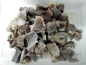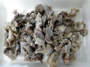 まずは血の固まりや汚れ(まったくなかった)を洗って、明らかにアブラだけという部分も取り除き、沸騰させた湯の中にいれ、
