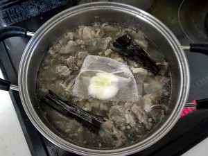 ゆで汁を鍋に戻して水を加え、回し切りにしただいこん、その上にすじ肉を載せ、お茶パックに入れてつぶしたにんにく(2カケ)、お酒(カップ1/2)、昆布(2枚)を入れて、仕上げの煮込みを開始・・・。