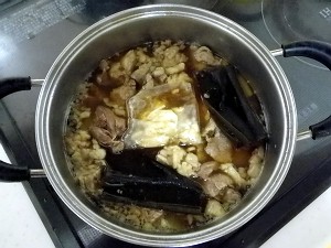 より分け作業がすんだら、堅めの部分からたっぷりの水で、落としぶた(アルミ箔だけど)をして煮込み、1時間半ほどして柔らかくなったところで柔らかい(ややこしい)部分を入れてさらに2時間ほど煮込む。