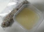 いったんすじ肉(この時点で650g)とゆで汁(700cc)を取り出し、それぞれを半分ずつに分ける。一度に食べるには多いと言うこともあるが、一番は醤油味と味噌味の二つの味を楽しみたい。残りの半分は冷凍に。