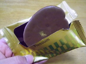 パッケージを開けると(ちょっと開きづらい)、こってりチョコでコーティングされたブツが出てきた。表の真ん中あたりには金粉が・・・さらに背中には割れないようにコースターのようなシートが添えられている・・・さすが「プレミアム」、扱いが違う(笑)。