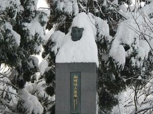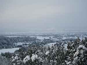 いつものように展望所からの散居村(L)、雪をかぶった松村謙三氏胸像(R)