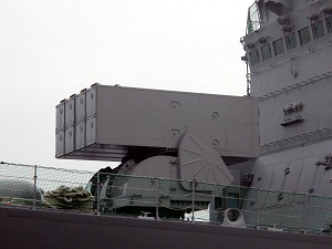 ハープーンSSM発射筒(L)、短SAMシースパロー8連装発射機(R)