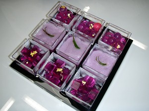 「法光の滴く」は、四角い「紫」の方が「金時草」、丸い「撫子」の方が「金時草+檸檬」で、どちらも(甘くない)ゼリーである。こちらは見た目も綺麗だし、葉っぱも入っていないので、食べづらいこともないが、やっぱり味は「金時草」そのものである。とりあえず「撫子」の方が「檸檬」が入ってる分、食べやすそうな気がしないでもないが、何も知らずに食べたら解らないと思う。