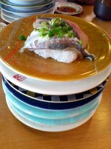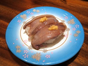あと・・・前の店を業態転換したということで・・・お皿はみな前のものを使っている(らしい)・・・ということは、(例えば)いきなり「かっぱ」が、前はきっと「大トロ」に使っていたと思われる金色のお皿に載って登場してくるのだ・・・これはちょっと笑える。
