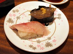 ここの売りは、全ネタ・一皿126円(税込み)という単一価格である。あるものなんでも、一皿たったの126円なのである。ただし、中トロとか値が張るものは、一貫ではなく半貫で、さらにその半分にはできないようなネタ(大トロ?ウニ?)はない。その代わり、食べたお皿の枚数×126円だから、やっぱり安心で、やっぱり計算しやすい!