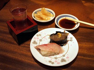 「地物・のど黒」にぎりと「地物・生いさざ」軍艦と日本酒「立山・吟醸」