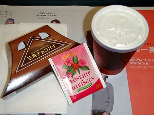 今日も、ちょいと一休みでマックへ。で、ついに食べてしまった( ̄ω ̄)「三角チョコパイ」