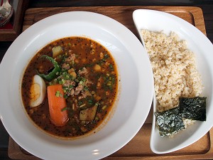 で、今日いただいたのは春の限定メニューの「ひき肉とひよこ豆のアジアンスープカレー(拡大写真)」・・・さらに、今日はご飯を玄米に、辛さを7にしてみた。やはり、寒いときには体の中から暖めるのが一番である。