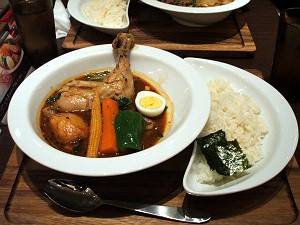 すでに有名なFCなので今更だが、個人的には、さらり感とスパイスが効き具合が気に入った。前に某所で食べたスープカレーは、割と味が濃く、それに比べればあっさりとしていて物足りなさもないではないが、食べ終わったあとの感じはむしろ良かった。(そもそもカレーと違う食べものなのだろうし・・・。)あと、最初は「ご飯・普通盛り」でしまった!?と思ったが、結果的にはオヤジの腹にはこれでちょうど良かった(それにメタボリックだし・・・)もちろん、チキンの肉離れの良さは言うまでもない。