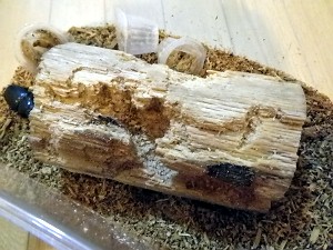 延期していた4日ほどの間で、囓ったあとも増えたようだが、まだ旧産卵木ほどではない・・・が、好みの問題もあるし、♀も疲れるだろうし、これ以上、幼虫が増えたりするのも悩ましいところなので、再延期はせず、本日をもって産卵セットを打ち止めに!!