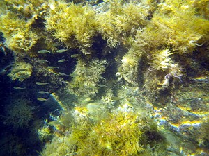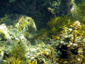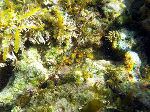 九十九湾の波打ち際で、スノーケルクリア、マスククリアー、フィンキックの練習をしたら、さっそく浅場でもう一練習・・・おやじがついて行くのはここまでで、あとは浅場でうろうろである。
