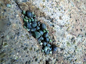 「クサフグ(幼魚)?」の群れ(L)、生息域が違う種が混在「タマキビ」と「アラレタマキビ」(R)