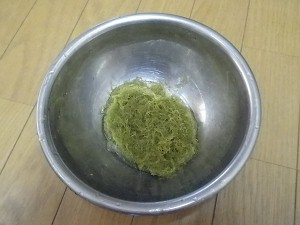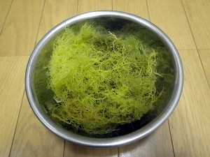 夕食後(間に合わなかった・・・)、早速、「イバラノリ(イギス)」の処理を開始・・・「小さな貝や砂がついている」とは言われたが、確かにゴロゴロ出てくる。で、一生懸命、洗っていたら・・・最初の量が嘘のようになってしまった (^-^;) ま、美味しく食べるためには仕方がないんだけどね。さて、どうやって食べるかなぁ。