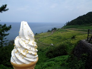 千枚田は黄金色に輝く稲穂が波をうち、まさに今が見頃である。どの黄金色を遠くに見ながら「金粉ソフト(500円)」を食べる。「金粉ソフト」とはその名のとおり、ソフトに金粉(はく)を振りかけたもので、「ブルーベリー」、「バニラ」、「キャラメル」の3種(各350円)のどれにでも振りかけることが可能である。が、さすがに先を考えると「キャラメル」はきつく、「ブルーベリー」は「桜峠」にもあるから、一番、優しそうな「バニラ」をお願いした。