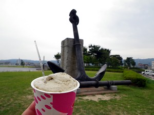 「能登空港」でスタッフと雑談しすぎて、ちょっとタイトになってきたので「能登ミルクジェラート/中島菜(300円)」を購入して、次へと向かう。