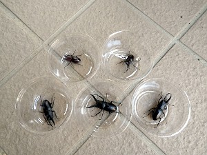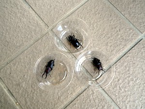 掘り出したノコギリ(ちっ!)は大きめの♂は1匹づつプリンカップ(小)に入れ、小さめの♂とメスは複数プリンカップ(大)に入れ、マットをかぶせてもう一度休眠していただくことに・・・でないと、あっという間にあの世に行ってしまうので・・・そして、来年の初夏、某公園で解放!!の予定!!