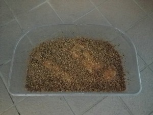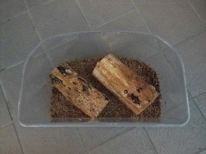 散乱一歩手前の産卵木は別ケースに移して湿度を保って保管し、一月半ほど過ぎたらいよいよ幼虫の割り出しである・・・さて、どうなっていることやら・・・。