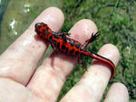 と、調査員S氏の呼ぶ声が・・・急いで向かうと調査のことではなくて、「イモリ」がいるとのお話・・・で、皆様のリクエストに応えて捕獲!・・・そして、「イモリ」と言えばやっぱりお腹の模様を確認だ!・・・撮影後はもちろんリリース・・・が、何を血迷ったか、乾いた=暑くなった黒マルチの上へ、そして動かなくなった (^-^;) 慌てて再捕獲&(水の中へ)再リリース・・・危ない危ない。