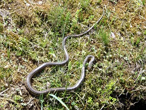 「イモリ」も一匹(L)、法面では「シマヘビ」が日光浴中(R)