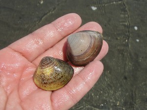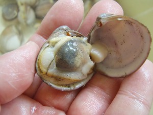 とさっそく、とれたのは4cmくらいの丸っこい貝・・・掘れば掘るほど出てくるのはこの貝ばかり・・・