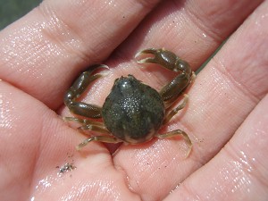 ごくたまにハマグリ(&マメコブシガニ)・・・が、この時点では(本当は家に着くまで)、この貝をバカガイだと勘違いして、喜び勇んでとりまくる2名・・・。