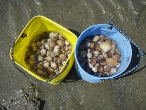 で、本日の成果は左の写真のとおり・・・大きな貝(こいつがバカガイ)も2つとれて(青のバケツ)、穫った貝は都合4種類となった。