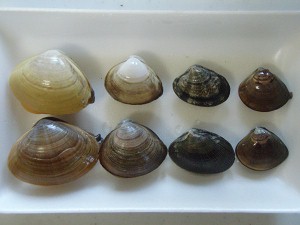 とりあえず、昨日、穫れた貝は左の写真のとおり4種類・・・上下は同じで、左からバカガイ、シオフキガイ、アサリ、ハマグリである。