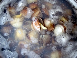 まずは殻の「どんび」を丁寧に洗う・・・どうせ、この後、茹でるといってもやはり綺麗な方が気分的には良いのである。で、洗ってザルに入れたら山盛り状態に・・・先を考えると憂鬱だが自業自得(笑)で、洗った「どんび」を沸騰した塩水に入れて、口が開くまで1~2分、茹でる。