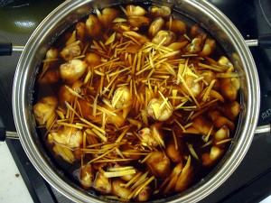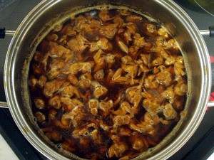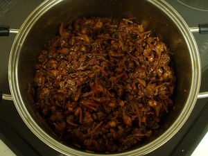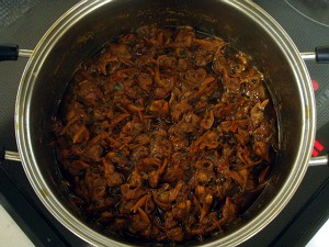 あとは、ワインを飲みつつ、ひたすら煮詰めていくだけ・・・ちなみに、今回は中火(目盛り3)で2時間、弱中火(同2)で1時間であった。で、火を止めて、さまして1時間たった状態が、右上の写真・・・出来上がりは685gで、上の分量からすると約30%に煮詰まった計算になる。