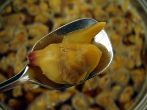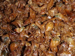 「どんび」のむき身が約1kg(L)、佃煮製造開始!!(R)