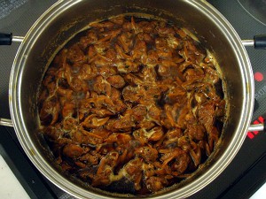 3時間経過、水分がほとんど無くなり出来上がり(L)、身は締まっちゃったけど佃煮だから(R)