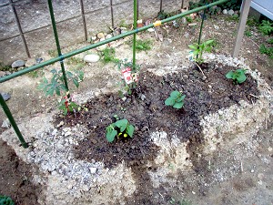 さて、ジャガイモの定植から1週間と1日、トマト・ピーマン・マコモの定植から1週間たったわけだが・・・ ジャガイモはようやく6株全部が発芽・・・といっても差が大きすぎるが・・・、一方、トマト2種は低温による損傷から回復し、ミニトマトは開花直前!で・・・マコモも順調に生育中!、このところの晴天さまさま・・・やはりお日さまは偉大だ!!
