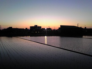 もっとも雨の方は昼過ぎには上がって、良い天気に・・・田植えの終わった田んぼに夕日が反射してとても綺麗だった。