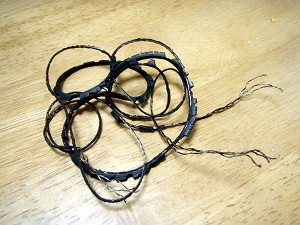 20分後、JAFさんが到着・・・ボンネットを開けてみると・・・ファンベルトが切れてファンの軸に巻き付いていた・・・そしてラジエーターの冷却水は風前の灯火?に・・・危ねぇ。