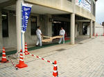 9時を過ぎ、お客も歩き始めたところで、先生の看板?が登場!今年は昨年よりさらに大きくなったため、係り一人では持ってはこられず、二人がかりで備え付け・・・マニアと先生付き広報のI氏はともかく、ほかの人はさぞかし・・・。
