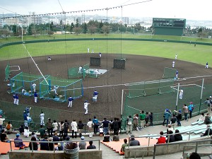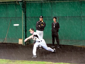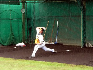 平日いうことで観客も少ないが、代わり?に雨が降っていて本日は宜野座ドームでの練習が中心・・・傘を片手にドームとブルペンを往復。それでもラッキーなことにブルペンの第一陣には球児投手に復活をかける久保田投手が・・・両投手ともかなり気合が入っていたようだが、今年こそ頼んまっせ!この組には久保投手とメッセンジャー、フォッサムの両助っ人投手もいたが、フォッサム投手は噂どおりの不思