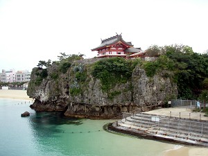 琉球のグスクを満喫したら、次は琉球一の宮・沖縄総鎮守の「波上宮」へ。ちょうど旧正月ということで、境内は本土の感覚だと一ヶ月ほど戻った雰囲気・・・でもこの暖かさは桜の頃・・・。ご朱印をいただいたら、海岸に張り出した断崖の上に立っているので有名なこの神社の全景(後ろ姿だけど)を撮影するために海岸へ。