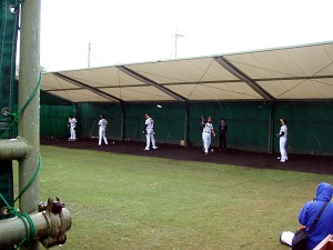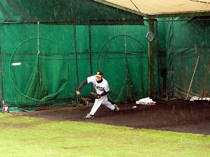 この後、何回かドームとブルペンを往復するが、雨は一向に止まず、サプライズの気配もなし・・・城島選手が練習後サインをしてくれるという噂もあったが、先を考えればあまりゆっくりもできないので、後ろ髪引かれる思いで宜野座を後に・・・矢野選手、下柳投手も含めて主力の姿は見ることが出来たので、続きは甲子園でということですな。