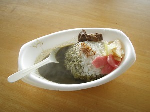 さて、その「奥飛騨ほうれんそうカレー」の正体は・・・その名の(見ての)とおり、ルーはほうれんそうがたっぷりの緑色、トッピングは飛騨牛のサイコロステーキ?が2つ、そして福神漬け(らっきょう)の替わりに「赤かぶ」、「セロリ」、「ヤーコン」の漬けもの三種という、奥飛騨の特産物いっぱいのカレーなのであった。