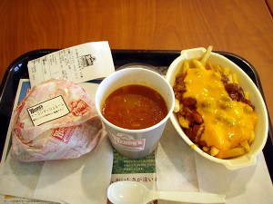 それはさておき「ベーコン マッシュルーム チーズバーガー」・・・マッシュルームが入ったチーズソースがたまりません・・・さすがに「フランクリン・アベニュー」の「マッシュルーム・バーガー」と比べちゃまずいけど・・・この値段なら十分です。もちろん「ウェンディーズ」とくれば「チリ」の「チリチーズフライ」もうまい。ただし、このセットで386+322+75=783kcal・・・ま、他のバーガーにくらべれば低い方なんだけど、昨日のフィットネス2時間での消費分をわずか10分で上回ってしまいました (^-^;)