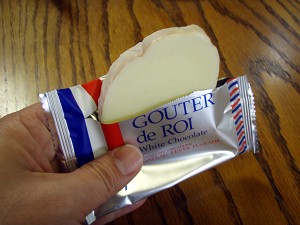 webサイトによれば「保存料を一切用いないフランスパン」から作ったラスク「グーテ・デ・ロワ」があって、その片面にホワイトチョコレートをコーティングしたのが、この「グーテ・デ・ロワ/ホワイトチョコレート」、ショコラで包んだのが「グーテ・デ・ロワ/プレミアム」だそうだ。