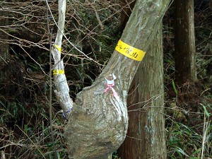登山口がある「牛塚峠」(L)、目印のテープ(R)