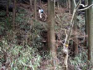 準備ができたら、早速、登山開始だが・・・いきなり急登、しかも道というより踏み跡がわずかにある程度、さらに倒木があって登りづらいったらありゃしない。へたすりゃ、道まで転落しそうなくらいである。が、一気に呼吸は乱れ、ぜぇぜぇ状態でようやく尾根道へ。