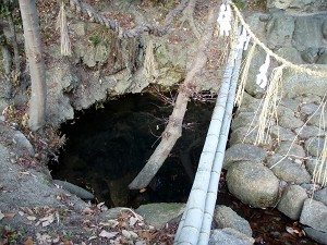 源義経が元服式を行った「鏡神社」の泉(L)、「鏡神社」(R)