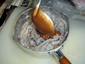 ごろを裏ごししてよく混ぜて(L)、イカ2~3ばいに1杯ほど加える(R)